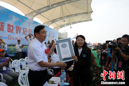 中新網(wǎng)鄂爾多斯8月12日電(記者 盧巖)一項沉寂十年之久的吉尼斯世界紀錄今天在鄂爾多斯被打破。作為首屆鄂爾多斯國際那達慕大會重要活動之一的“萬人多米諾”項目暨吉尼斯世界紀錄挑戰(zhàn)活動在東勝圓滿落幕,刷新了由新加坡在2000年創(chuàng)造的9234人的紀錄。