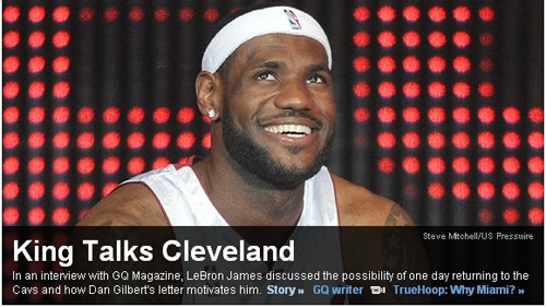 中新網8月18日電 在九月的《GQ》雜志專訪上,“皇帝”詹姆斯首次敞開心扉,談到了他為何會出走至熱火打球,以及未來重返克利夫蘭效力的可能性。