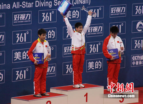 中新社濟(jì)南9月18日電 (張譯文)2010—2011中國(guó)跳水明星系列賽第二站的比賽18日晚繼續(xù)在濟(jì)南舉行。在剛剛結(jié)束的男子10米跳臺(tái)決賽中,北京選手曹緣憑借完美發(fā)揮獲得105.45高分奪得冠軍,亞軍、季軍分別被來自廣東的張雁全和上海的火亮獲得。