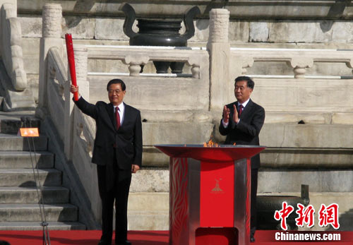 隨后,廣東省委書記汪洋從火種衛(wèi)士手中接過引火棒,點燃祈年殿前的火種盆。中共中央總書記、國家主席胡錦濤在火種盆中點燃了主火炬,亞運(yùn)北京首棒火炬手張琳從胡錦濤手中接過了火炬“潮流”。