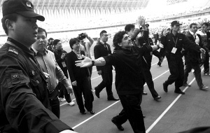 終場前5分鐘,主席臺上的馬拉多納終于起身,現(xiàn)場主持人興奮得馬上宣布,“馬拉多納因為有腿傷,特地半小時前打了封閉,現(xiàn)在可以下場踢球了!币粫r間,全場又是一陣歡呼聲。不過,此時全場最搞笑的一幕出現(xiàn)了,腳穿皮鞋的馬拉多納在贊助商陪同下走到場邊,然后,對著場內(nèi)大呼小叫了一番,前后不過三四分鐘時間,主裁就吹響全場結(jié)束哨聲?磁_上,至少花200元錢買票入場的球迷這才發(fā)覺上當(dāng),終于爆發(fā)出陣陣吼聲:“騙子,退票!退票!”此時,老馬頭也不抬,一溜煙跑回了休息室。記者 徐東海