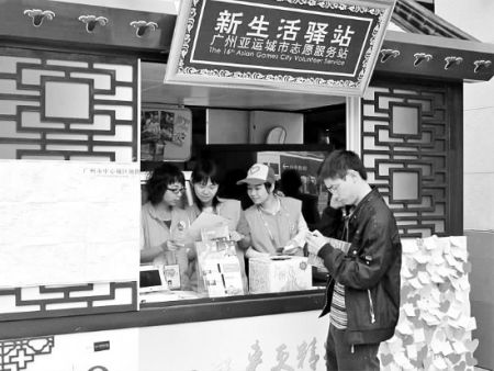 昨天下午當(dāng)班的黃洪丹,是廣東交通職業(yè)學(xué)院的大二學(xué)生,也是同行8人的班長(zhǎng)。她為記者一一介紹了站內(nèi)各種方便設(shè)施,告訴記者今天短短幾個(gè)小時(shí),她們已經(jīng)接待了100多位前來(lái)咨詢的朋友,“就是剛才,我們剛給一大幫外國(guó)朋友指了去亞運(yùn)村的路呢。”