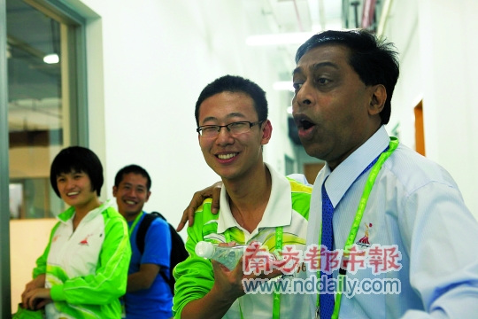 結(jié)果本該短短兩分鐘的路程,我們竟然走了大半天。因?yàn)楣芬怀鲩T看見一位中國志愿者小伙子臉上沒笑容,就摟著他說:“嘿,你干嘛不笑一笑,你看上去比我還老!比缓笏蛽е@個志愿者問記者:“我年輕還是他年輕?”記者識趣地回答:“當(dāng)然是您!彼_心地哈哈大笑。原以為就到此結(jié)束了,忽然走來一位頭發(fā)已花白的馬來西亞隊(duì)官員,哈利姆立刻放開志愿者小伙子,摟住這位老人家,然后又問一遍記者:“我年輕還是他年輕?”