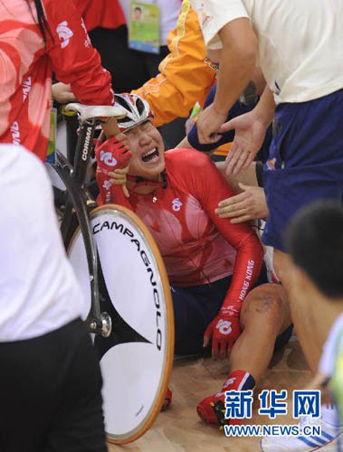 11月16日,中國(guó)香港選手刁小娟在比賽中摔倒受傷,表情十分痛苦。隨后她因傷退出比賽。當(dāng)日,第16屆亞運(yùn)會(huì)場(chǎng)地自行車(chē)女子計(jì)分賽發(fā)生了嚴(yán)重的車(chē)輛相撞導(dǎo)致車(chē)手摔倒的事故,幾名選手因傷退出比賽。新華社記者李尕?cái)z