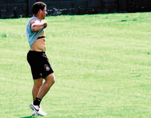 羅納爾多知道訓練場邊有很多記者,在過去,他對記者的鏡頭十分防備,絕不輕易讓他們拍到自己發(fā)福的身體,但這一次卻十分例外。他撩起訓練衫,一臉愜意,然后叫著:“拍這里,看,平的!”在科林蒂安,羅納爾多的心情變化是明顯的。
