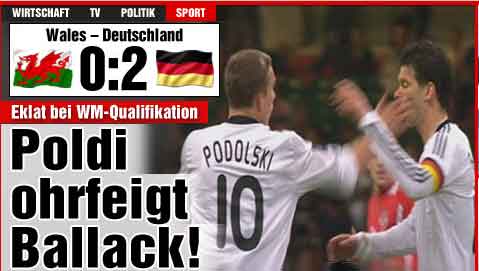 雙方易地再戰(zhàn),第48分鐘德國(guó)隊(duì)發(fā)動(dòng)攻勢(shì)造成對(duì)方禁區(qū)內(nèi)混亂,威廉姆斯自擺烏龍幫助德國(guó)隊(duì)將比分改寫(xiě)為2-0。不過(guò)第72分鐘,場(chǎng)上發(fā)生了令人匪夷所思的一幕,波多爾斯基對(duì)隊(duì)長(zhǎng)巴拉克的批評(píng)不服氣,一把將其推開(kāi)順勢(shì)甩了巴拉克一個(gè)耳光,不過(guò)隨后被隊(duì)友息事寧人拉開(kāi),但這一切都被現(xiàn)場(chǎng)的兩萬(wàn)多名球迷和媒體看在了眼里。