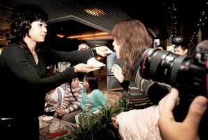 “粽子”們的舉動(dòng)讓韓端激動(dòng)得不知說什么才好。她拿起小刀切開蛋糕發(fā)給“粽子”和記者!皝(lái),我們以蛋糕代酒,感謝你們對(duì)我的支持!”韓端說著給在場(chǎng)的人喂蛋糕。