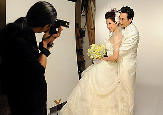 這對(duì)新人在去年九月份領(lǐng)取了結(jié)婚證。在拍攝婚紗照的時(shí)候他們始終保持著微笑,不過(guò)偶爾李佳薇也會(huì)感到有些別扭!坝袝r(shí)候我都快不能呼吸了,”李佳薇穿著婚紗說(shuō)。她為北京和新加坡的婚禮宴會(huì)總共定做了13套婚紗。