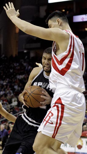 雖然說(shuō)火箭最終輸?shù)袅吮荣,但是我們卻在比賽中欣喜的看到了一件事情,那就是,姚明在面對(duì)自己的老對(duì)手鄧肯的時(shí)候,終于扭轉(zhuǎn)了自己一貫以來(lái)的頹勢(shì)。其實(shí)在NBA中一直就有這么一種說(shuō)法,鄧肯在場(chǎng)上怕奧尼爾,奧尼爾怕姚明,而姚明則怕鄧肯,三人之間形成了一個(gè)循環(huán)套。,但是,今天姚明的表現(xiàn),卻接開(kāi)了這個(gè)循環(huán)套中打得最死的一個(gè)結(jié)。