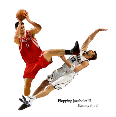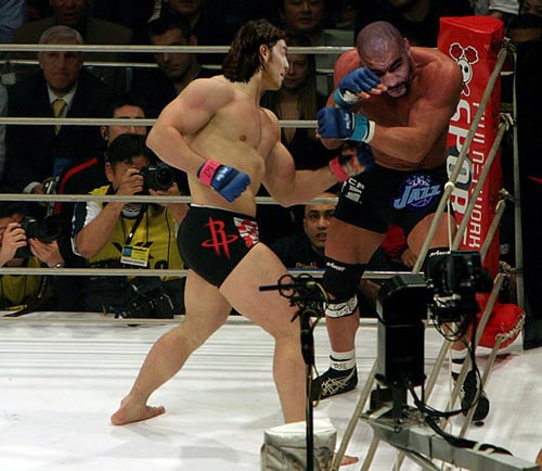 白人拳手斯科拉身著一條印有火箭隊徽的黑色拳擊短褲,在拳擊臺上勇猛無比,他正以一記左勾拳刺向布澤爾,而且雖然只是一個側(cè)面,但隱約可見斯科拉神情專注,殺氣騰騰,一副志在一拳將其KO倒地的氣勢。而肌肉比斯科拉更發(fā)達的布澤爾,則一副饒命相,他蜷縮在拳臺的角落,左手試圖擋住斯科拉刺出的重拳,右手則十分猥瑣地護住自己的眼睛,似乎只有招架之功,而毫無還手之力。不過這張PS圖片也有漏洞,一則是拳擊場上運動員穿的應該不是緊身短褲,二是兩人的短褲的顏色不應該都是黑色。不過總的來說,這張圖片PS得非常成功,布澤爾短褲上的爵士隊標清晰可見,而且兩人的神態(tài)也是惟妙惟肖,直接反應出了斯科拉的強勢和布澤爾的不堪一擊。