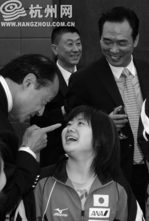 歡迎晚宴上,中國(guó)乒乓球界的重量級(jí)人物一撥接一撥過來敬酒,國(guó)家體育總局副局長(zhǎng)蔡振華、原中國(guó)乒協(xié)主席李富榮、中國(guó)乒協(xié)副主席姚振緒,國(guó)家男、女隊(duì)主教練劉國(guó)梁、施之皓……焦點(diǎn)都在中間的日本隊(duì)一桌,桌邊那個(gè)身著褐紅色長(zhǎng)袖隊(duì)服、一頭淺黃短發(fā)的胖乎乎的小姑娘身上。