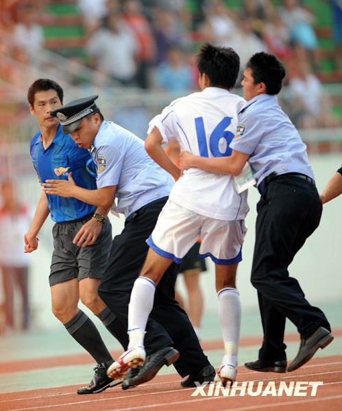 如果說賽后的追打是“大餐”的話,比賽進(jìn)行到90分鐘時14號劉青被何志彪紅牌罰下后的推搡動作則是“開胃小菜”。此前,天津隊的9號梁杰和10號馬磊磊已被紅牌罰下。當(dāng)梁杰因故意蹬踏被罰下的時候,天津隊門將李根跑到中圈附近的事發(fā)地點(diǎn),邊質(zhì)問裁判邊高喊:“不踢了,不踢了!标爢T也都跟著李根往球場外跑。在主教練孫建軍的勸說下,球員才重新回到比賽當(dāng)中。