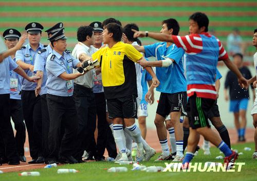 14號劉青在休息室門口看到此景,試圖掙脫警察的阻擋沖上前去。就在天津隊員追打裁判時,一名球員將裁判的電子記錄牌扔在地上狂踩。這時,警察趕到將天津隊員強(qiáng)行分離,并送至球場內(nèi)。看臺上的山東觀眾發(fā)出噓聲,并將水瓶扔向天津隊員。一名天津隊員向看臺伸出了中指,已坐在球場中間的李根聽到球迷的罵聲后再次沖出人群試圖爬上看臺,被警察制止。