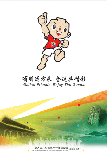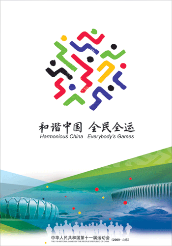 設計中選用了武術、籃球、帆船三個項目為主要內容,武術動作的背景中融合了群山和松樹的內容;籃球項目動作的背景中融合了奔騰黃河的形象;帆船項目則在風帆中融入了大海的壯觀景象。動感的運動人形與畫面背景中具有代表性的海、山、黃河融為一體,著力表現(xiàn)祖國河山的壯麗和秀美。