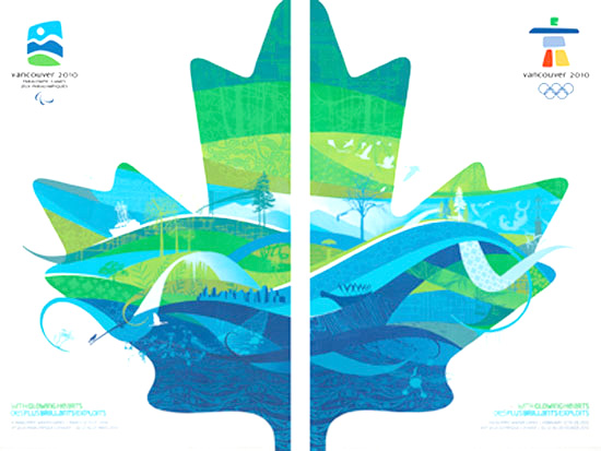 冬奧會(huì)和冬季殘奧會(huì)海報(bào)的主體都是半片楓葉,不同的是前者楓葉靠左,右上角是2010年冬奧會(huì)會(huì)徽;后者靠右,左上角為2010年冬季殘奧會(huì)會(huì)徽。兩者拼接在一起,則構(gòu)成一片完整的楓葉。與傳統(tǒng)上象征加舀大的紅色楓葉不同的是,這兩張海報(bào)上的楓葉顏色是藍(lán)鸀白相間,代表著溫哥華冬天的顏色--藍(lán)天、大海和雪山。楓葉上充滿動(dòng)感的、不同形狀的線條,以及冰球、花樣滑冰和高山滑雪等項(xiàng)目的插圖則傳達(dá)著冬奧會(huì)的元素。
