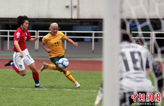 中新網(wǎng)成都5月21日電(記者劉賢 劉忠俊)2010年女足亞洲杯第二輪小組賽21日下午在成都舉行。繼首場(chǎng)2比0勝越南后,澳大利亞今日再以3比1勝韓國,確保小組出線。
