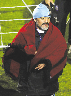 當阿根廷隊剛剛結束訓練,馬拉多納一行正要返回更衣室,這時兩個來自薩爾塔市(布宜諾斯艾利斯以北的小城)的阿根廷記者走了過來向老馬講述了他們長途跋涉帶來禮物和祝福的故事,馬拉多納本來是快步走向更衣室的,聽到記者的故事立刻停了下來!斑@是來自San Antonio de Los Cobres,一個海拔4000米小城孩子們的禮物,他們托我們?yōu)槟銕砹颂鹤!甭牭竭@里馬拉多納的真性情顯露無遺,接過毯子立刻披在了身上。這個被提到的小城叫做 San Antonio de los Cobres,距薩爾塔市約180公里,距布宜諾斯艾利斯約1750公里,海拔高達4000米,那里的球迷無法通過電視來觀看世界杯的比賽,但是他們一樣喜歡馬拉多納,關注阿根廷隊。許凱 黃啟元 本報南非專電
