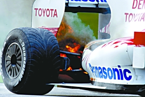 昨日,F(xiàn)1車隊在阿爾加夫賽道舉行的首輪季前測試進入第三日。圖為德國車手格洛克駕駛的豐田TF109賽車在測試中車尾著火,事故原因不詳。