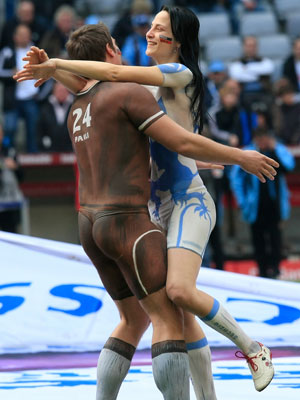 德乙聯(lián)賽第22輪,慕尼黑1860在主場以5:1大勝圣保利。 終場前從主客兩隊的看臺上分別躍下一個身穿1860隊服的姑娘和一個身穿圣保利隊服的小伙,兩人一路狂奔來到球場中圈,旁若無人的熱吻起來。仔細觀察才能發(fā)現(xiàn)他們所穿的“隊服”的奧秘----這對情侶都只穿了一條內(nèi)褲,他們身上的衣衫完全是足以亂真的人體彩繪。現(xiàn)場保安也為這浪漫一幕所感動,他們面帶微笑將這對情侶請出草坪。(圖片來源:1860隊官方網(wǎng)站)