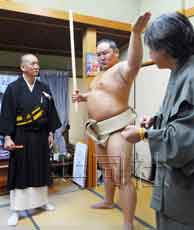 下午4點(diǎn)半過后,來到工作室的朝青龍笑著說:“這是第一次,所以很緊張。我會(huì)努力的!背帻埾瞪习咨鄵溲鼛,右手持寶棒,左手抬起,擺出憤怒的表情,拍下了照片。