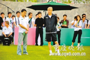 昨天北京氣溫驟降,下起了大雨。一直到中午,大雨才停。下午兩點半,50歲的溫格準(zhǔn)時出現(xiàn)在球場邊,雖然天氣偏冷,但仍然穿著短褲運(yùn)動衫,顯示了一位職業(yè)教練的素養(yǎng)。在對這支中學(xué)生希望隊進(jìn)行20米T字跑、彈跳等基本測試后,溫格選出了10名隊員分成兩組進(jìn)行15分鐘的對抗賽。在觀看這些未來之星的表現(xiàn)時,溫格像在英超執(zhí)教一樣認(rèn)真,并給了隊員們適當(dāng)?shù)慕ㄗh。