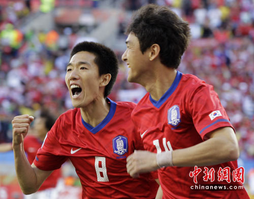 中新網(wǎng)6月12日電 北京時(shí)間今晚,在南非世界杯B組的一場(chǎng)小組賽中,韓國(guó)隊(duì)?wèi){借李正秀和樸智星的進(jìn)球2-0完勝希臘取得開(kāi)門(mén)紅。這也是韓國(guó)參加世界杯以來(lái)在本土外的第二場(chǎng)勝利。
