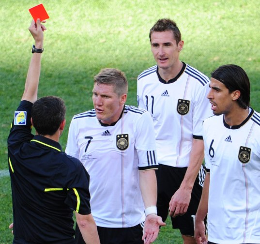 在上半場,德國隊還占據(jù)場上的主動。不過克洛澤在第12分鐘就吃到一張黃牌,而其隊友也不斷被西班牙隊出示黃牌。第37分鐘,克洛澤在防守斯坦科維奇時,先鏟倒了球,這是一個可判可不判的犯規(guī),一般的裁判只會給個口頭警告。結果主裁判烏迪亞諾竟在未口頭警告的情況下,直接就出示第二張黃牌將其罰下。