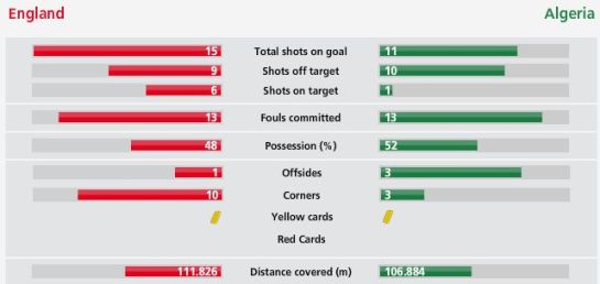 雖然英格蘭隊(duì)有魯尼、杰拉德、蘭帕德、特里等眾多大牌球星,但是他們的控球時(shí)間竟然不如對(duì)手,比對(duì)手低了4%。在越位方面,阿爾及利亞以3次領(lǐng)先于英格蘭隊(duì),可見(jiàn)其進(jìn)攻之心略為強(qiáng)烈。此外,英格蘭隊(duì)全場(chǎng)有10次角球,但都沒(méi)有轉(zhuǎn)化成進(jìn)球。