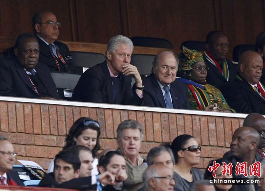 中新社比勒陀利亞6月23日電 23日下午,美國(guó)前總統(tǒng)比爾·克林頓與國(guó)際足聯(lián)主席布拉特,在比勒陀利亞洛夫托斯球場(chǎng)一同觀看了美國(guó)隊(duì)與阿爾及利亞隊(duì)之間的“生死之戰(zhàn)”。