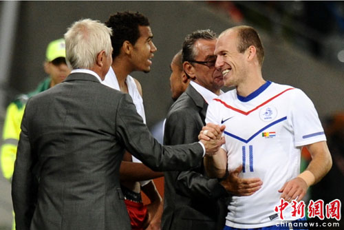 第76分鐘,埃托奧接隊(duì)友妙傳大力射門,皮球勢大力沉打在后衛(wèi)身上。第83分鐘,荷蘭隊(duì)卷土重來。替補(bǔ)登場的羅本接斯內(nèi)德妙傳轉(zhuǎn)身之后射門擊中立柱,亨特拉爾侯個正著輕松推射空門,將比分鎖定為2-1。荷蘭隊(duì)在獲得一場勝利的同時,也鎖定了自己的小組頭名位置。