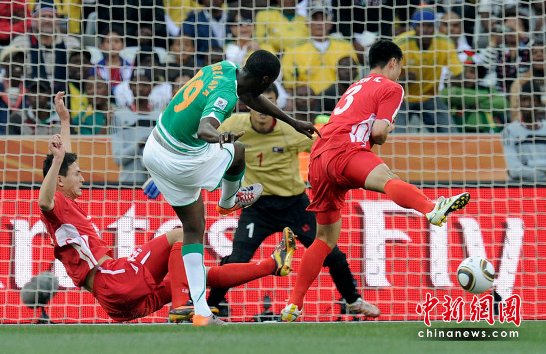 第11分鐘,科特迪瓦隊邊路策動進攻,埃布將球傳中,德羅巴接到頭球攻門將球打入,不過他和另外一名隊友都處于越位位置,進球無效。1分鐘后,科特迪瓦隊再次發(fā)動猛攻,熱爾維尼奧禁區(qū)內(nèi)打門,球被朝鮮隊門將李明國撲住。