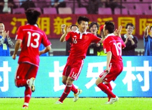 現(xiàn)場球迷的熱情被點燃,“3比0”的喊聲響徹全場。中國隊沒有辜負球迷的期望,替補出場的李學(xué)鵬搶斷后突破至對方小禁區(qū)內(nèi)抽射破門,將比分鎖定為3比0。整場比賽,中國隊共出場22名隊員。