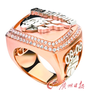 據(jù)鉆戒設計人員透露,為使設計更加新穎,在材質的挑選上采用了正逐漸成為全球珠寶市場主流的18K玫瑰金,每枚重達40克,頂部鐫刻著廣東隊的隊標,環(huán)繞以79粒晶瑩的高品質鉆石;戒指的右側面鐫刻著“08-09”的字樣和CBA籃球面孔的標志,左側是球員姓名及球衣號碼;指環(huán)下方用鐳射技術刻有“戴夢得”的字樣。整個戒指通體造型渾厚穩(wěn)重,溢彩流光,充分表現(xiàn)出冠軍球隊的王者之氣。戒指上的信息全部采用工藝復雜的分件倒模技術,呈現(xiàn)凸字效果,增加戒指立體感及時尚感。