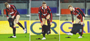 不知是不是太過賣力,動作幅度太大,貝克漢姆的球褲在比賽中竟然撕裂了。向裁判申請后,米蘭隊工作人員將新球褲遞了上來,場上的萬人迷直接站在草地上,一把扯下身上的球褲,扔在地上,再將新球褲穿了上去。整個動作連貫流暢,沒有一絲猶豫,不過在他彎腰的時候,全場觀眾仍然看到了他的黑色緊身內(nèi)褲下屁股的線條,這遠(yuǎn)遠(yuǎn)比貝克漢姆的腳法更容易讓女球迷激動。