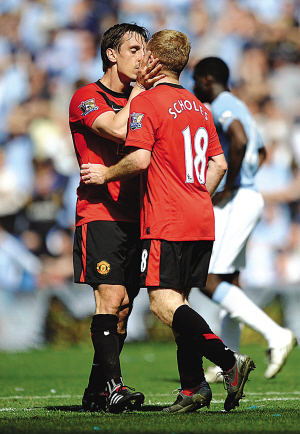 英超第35輪的一場強(qiáng)強(qiáng)對決,自然是曼城斯特市的同城德比。最終,曼聯(lián)憑借35歲的老將斯科爾斯在下半場補(bǔ)時第2分鐘的頭球絕殺,在客場以1:0險勝同城死對頭曼城隊(duì)。令人意外的是,同為35歲的曼聯(lián)隊(duì)長加里·內(nèi)維爾居然在場上公然激吻進(jìn)球功臣斯科爾斯以示慶祝。