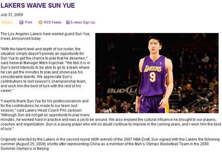 中新網(wǎng)8月1日電 當(dāng)?shù)貢r(shí)間7月31日,NBA上賽季冠軍湖人隊(duì)通過官方網(wǎng)站,宣布放棄來自中國(guó)的后衛(wèi)孫悅。