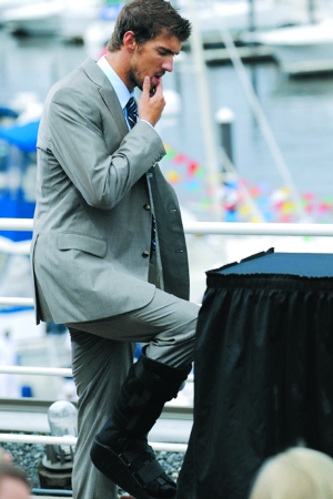 對(duì)菲爾普斯來(lái)說(shuō),戰(zhàn)勝奧尼爾似乎不那么簡(jiǎn)單,因?yàn)樗谥暗能?chē)禍中弄傷了右腳,發(fā)布會(huì)上,他全程都用護(hù)具緊緊包裹著傷腳,但是菲爾普斯笑著說(shuō):“兵不厭詐,這個(gè)護(hù)具將會(huì)對(duì)奧尼爾造成困惑,他一定會(huì)迷惑我到底能發(fā)揮到幾成,哈哈,我們賽場(chǎng)上見(jiàn)!