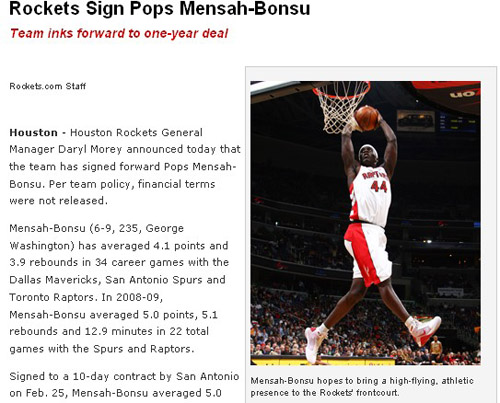 中新網(wǎng)9月4日電 北京時間今日,火箭官方宣布簽下英國內(nèi)線波普-門薩邦蘇,他的非保障性合同為期一年。門薩邦蘇目前不能確定在火箭打完整個2009-10賽季。