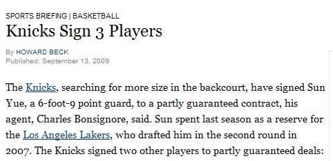 中新網(wǎng)9月14日電 北京時(shí)間昨日晚,《紐約時(shí)報(bào)》曝料稱:孫悅的經(jīng)紀(jì)人查爾斯·包辛諾透露,尼克斯已經(jīng)同中國球員孫悅簽訂了一份部分保障合同,補(bǔ)強(qiáng)球隊(duì)后場。