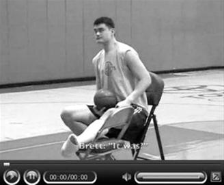到達(dá)豐田中心之后,左腳打著石膏的姚明拄著拐杖坐上火箭的擺渡車(chē),前往訓(xùn)練場(chǎng)。在訓(xùn)練場(chǎng)上,火箭隊(duì)球員主管布萊特·甘寧前來(lái)幫助姚明進(jìn)行投籃訓(xùn)練,而姚明坐在凳子上,打石膏的左腿架在椅子上,就以坐姿進(jìn)行投籃訓(xùn)練。