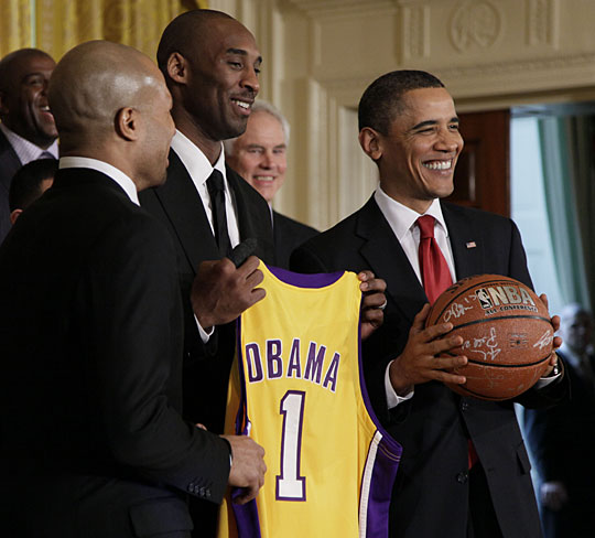 北京時間1月26日,NBA總冠軍洛杉磯湖人隊借著來到華盛頓與奇才比賽的機(jī)會參觀了白宮。美國總統(tǒng)奧巴馬親切會見了湖人全隊,并接受了一件印有1號號碼的湖人球衣饋贈,他隨后與湖人隊合影留念。據(jù)洛杉磯時報報道,現(xiàn)場氣氛友好祥和,每個人的臉上都掛著微笑,奧巴馬在演講中表示他認(rèn)為科比是自己見過最有求勝心的球員之一。