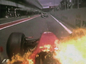 科瓦萊寧在進(jìn)站對賽車進(jìn)行修整后在加油管并未拔出的情況下便急匆匆駛離位置,硬生生將輸油管扯斷,導(dǎo)致燃油灑落在后面法拉利車隊的萊科寧車上,由于車體溫度很高,F(xiàn)60頓時起火,好在冰人立即擺頭將賽車駛離正路才避免更嚴(yán)重的事故發(fā)生,而科瓦萊寧在布朗GP車隊工作人員的幫助下才卸掉了被扯斷的輸油管。萊科寧回憶那驚險的一幕時說,MP4-24的美孚燃油進(jìn)入了他的眼睛。