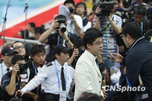 昨天東亞運(yùn)的跳水比賽,當(dāng)現(xiàn)場(chǎng)司儀介紹隊(duì)員名單時(shí),霍啟剛起身走出貴賓室,來(lái)到看臺(tái)上的貴賓席。此時(shí),記者乘機(jī)進(jìn)了貴賓席,“潛伏”在霍啟剛的后一排,與他的距離不到30厘米。