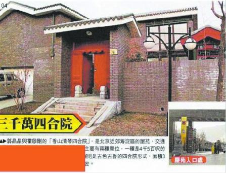 現(xiàn)在,越來越多的跡象都在表明郭晶晶和霍公子的婚期已近。昨天,香港一媒體爆出郭晶晶正準(zhǔn)備裝修去年霍家所贈的價值3000萬人民幣的豪華別墅,并稱“這很有可能就是他們倆在北京的婚房!”據(jù)說,這套別墅位于北京海淀區(qū)四季青鎮(zhèn)門頭村,在五環(huán)以外。據(jù)記者了解,該樓盤的中式院落獨棟別墅面積為300—550平米之間,另外,每棟別墅送150平米的地下室。該別墅在2007年的預(yù)估開盤價就高達55000—60000元/平米。難怪媒體都將這一帶的房子稱作“北京頂級私人豪宅群落!