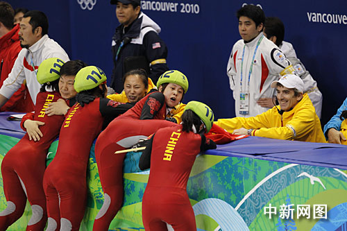在裁判宣布韓國(guó)隊(duì)犯規(guī)后,一直等候著最終結(jié)果的中國(guó)姑娘忘情地?fù)湎蚪叹毾D片清楚地顯示,興奮的王濛撲到教練李琰前面寬寬的防護(hù)墊上,她的右腿無(wú)意間高高抬起,冰刀刮到了跟在她身后的張會(huì)的下巴。王濛意識(shí)到自己闖了禍,馬上關(guān)切地回頭察看張會(huì)的傷情。四位姑娘舉著國(guó)旗慶祝勝利時(shí),張會(huì)用手捂著她的下巴,漸漸地鮮血浸濕了她的手套。