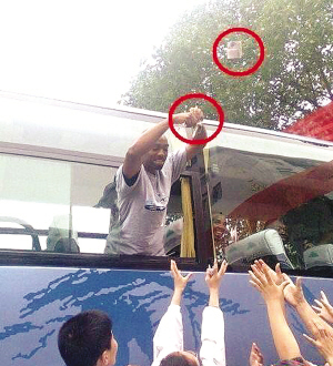 5月23日晚上,湖南湘西某地有關方面邀請美國體育使者男子明星籃球隊與立陶宛蘇托瓦職業(yè)男子籃球隊在該地體育館舉行對抗賽。賽前,兩支球隊分別到當?shù)氐囊恍┲袑W進行訪問,然而,在5月22日美國體育使者男子明星籃球隊到市第一中學訪問時出現(xiàn)讓人憤怒的一幕,一美國球員在車輛離開校園時打開窗戶,向圍觀的中學生撒人民幣,造成現(xiàn)場一度失控。