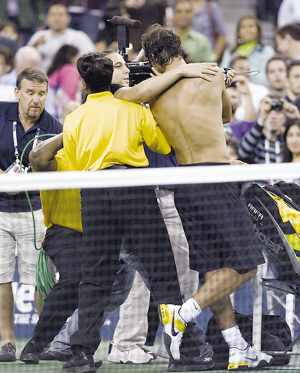 在9月8日納達(dá)爾戰(zhàn)勝法國選手蒙菲斯的比賽后,一名男子沖入場地并親吻了納達(dá)爾,他也因此遭到逮捕。