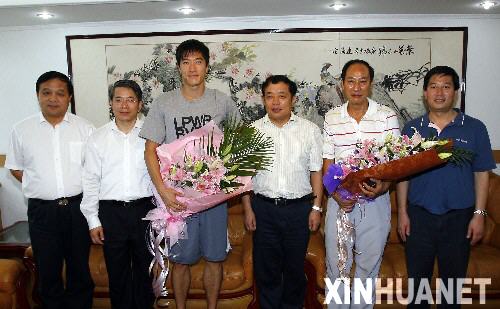 上海莘莊訓(xùn)練基地,上海市普陀區(qū)委書(shū)記周國(guó)雄等人當(dāng)日代表普陀父老鄉(xiāng)親為即將出征全運(yùn)會(huì)的劉翔壯行——?jiǎng)⑾枋恰巴辽灵L(zhǎng)”的普陀人。灰色T恤,灰色短褲,踏一雙亮黃色的運(yùn)動(dòng)鞋,剛睡過(guò)午覺(jué)的劉翔看起來(lái)氣色不錯(cuò)。
