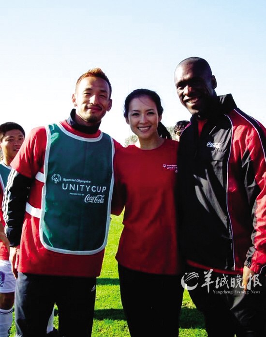 據(jù)悉,章子怡于2006年起擔(dān)任特奧會(huì)全球形象大使,至今已有4個(gè)年頭。這一次,特奧會(huì)舉辦的“團(tuán)結(jié)杯”比賽旨在讓全社會(huì)接納和包容智障人士。章子怡說(shuō):“這次在世界杯期間受邀來(lái)到南非,主要是希望通過(guò)足球這項(xiàng)大家都熱愛(ài)的運(yùn)動(dòng),讓更多人了解智障這個(gè)群體!绷硗猓吞貖W運(yùn)動(dòng)員一起參加比賽練習(xí)的還有“亞洲足球先生”中田英壽、NBA球星迪坎貝·穆托姆博、AC米蘭隊(duì)員克拉倫斯·西多夫等。在練習(xí)過(guò)程中,章子怡還跟中田英壽學(xué)習(xí)背后傳接球的動(dòng)作,沒(méi)想到還一次成功,贏得了現(xiàn)場(chǎng)很多人的掌聲。