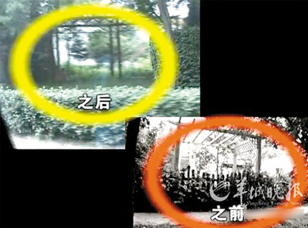 昨天上午11時(shí),記者再次來(lái)到郭宅后院,記者發(fā)現(xiàn)3個(gè)小時(shí)之前仍然存在的侵占公共綠地的綠色木柵欄已經(jīng)被拆除大部分,周邊只剩下部分被拔下來(lái)的柵欄殘骸。但是院內(nèi)假山、水池,以及綠色涼亭仍然存在。據(jù)了解,之前城管部門(mén)曾經(jīng)確認(rèn)此部分也屬違建。